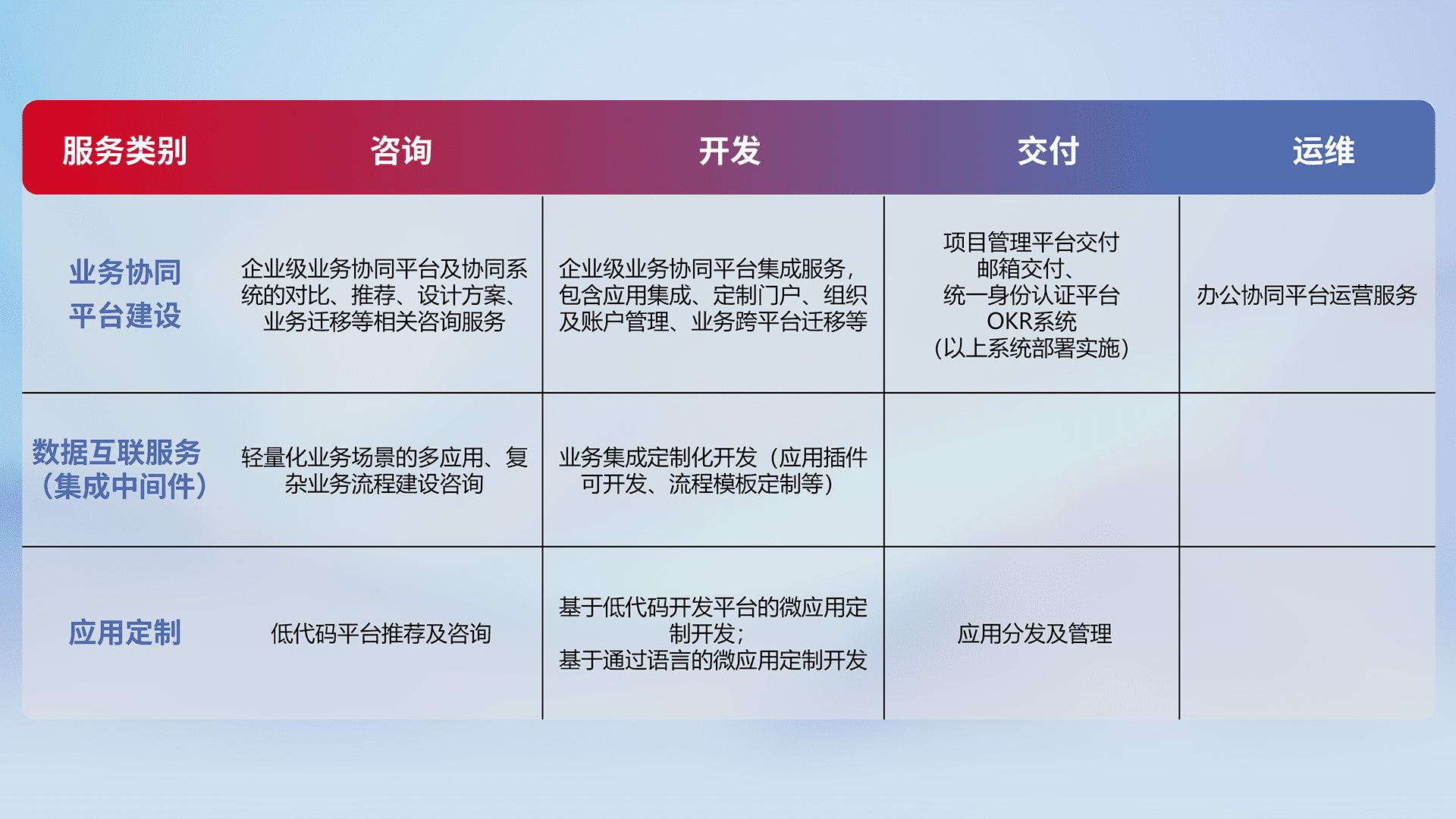 针对钉钉、、、、企微、、、、IDaas等平台级产品提供产品的规划、、方案、、、、交付、、定制化开发等服务,,实现如统一协同办公、、、、智能客户服务、、、、混合会议管理、、、、智能数据查询、、、等业务场景,,,实现数字化转型。。。。
